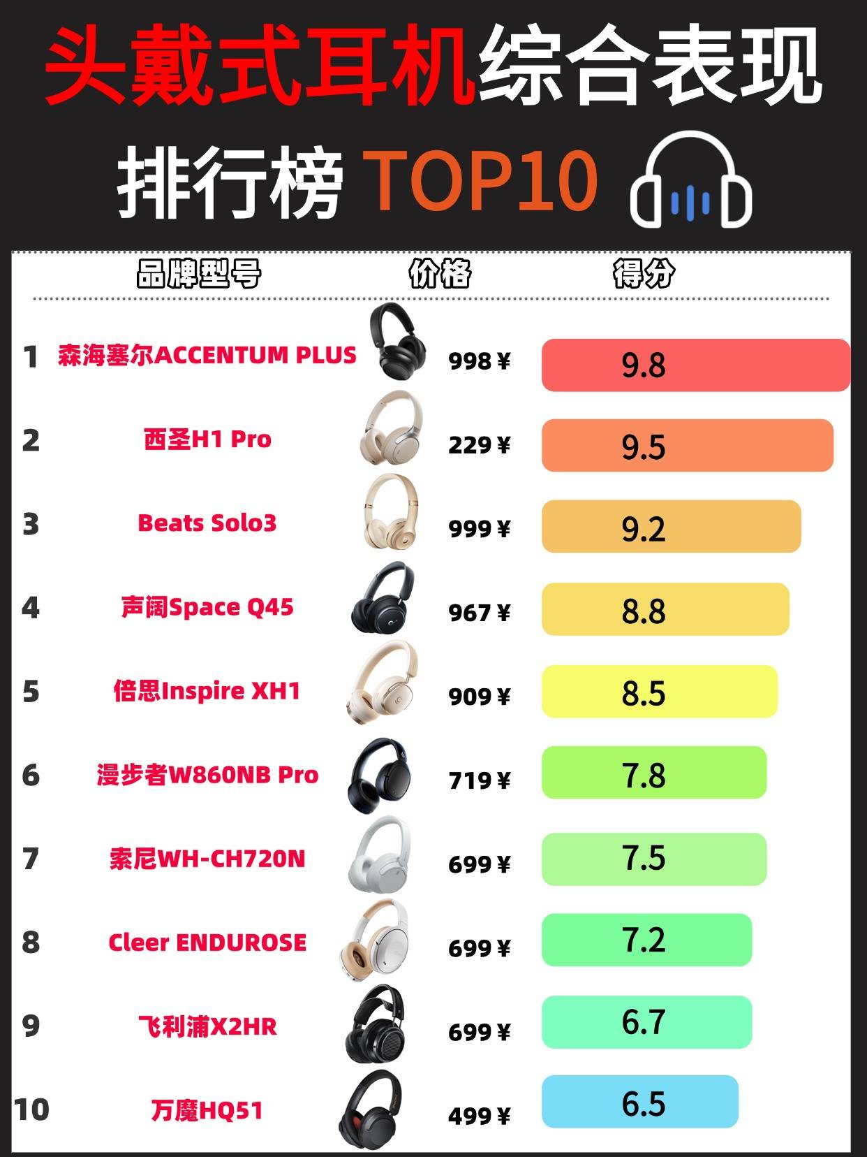 下面是我整理了专业机构对热门头戴式耳机的测评排行图表,大家可以参考其中的数据做出选择。