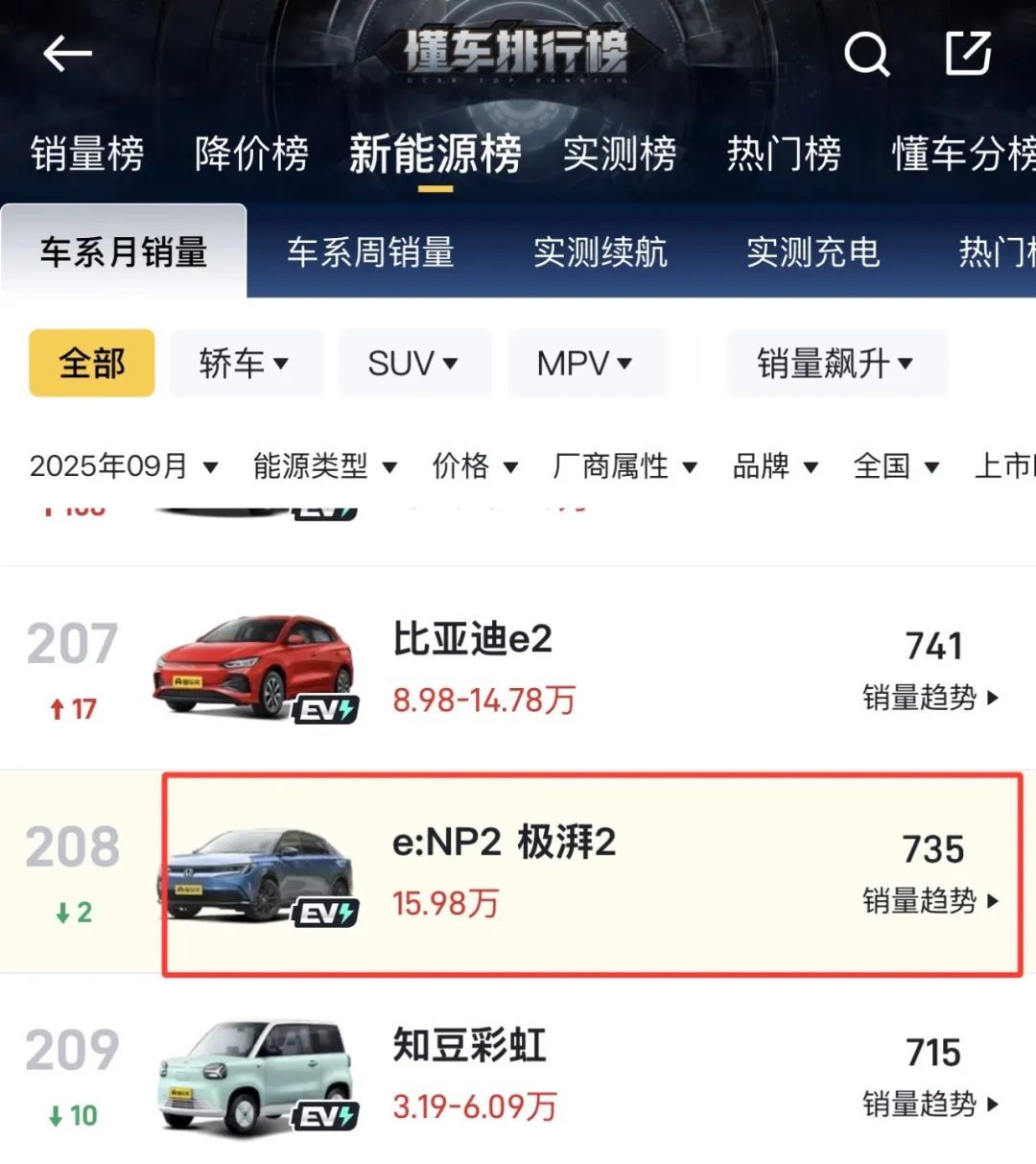 广汽本田的新能源转型就更为“落后”。官方显示,广汽本田旗下新能源车型共有5款,从雅阁ACCORDe:PHEV、皓影BREEZEe:PHEV等命名来看,给人满满的“油改电”既视感。销量也同样惨淡,懂车帝数据显示,9月广汽本田新能源车型销量最高的为e:NP2极湃2,月销735辆。