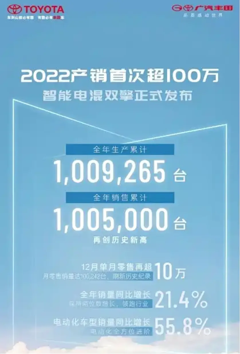 巅峰时期,广汽本田年销量突破80万辆,广汽丰田更是在2022年创下100.5万辆的销量纪录,成为东风日产之后,第二家实现年销百万辆的日系车企。彼时,两大合资品牌成为支撑广汽集团规模的“双引擎”,贡献着集团近六成的利润。