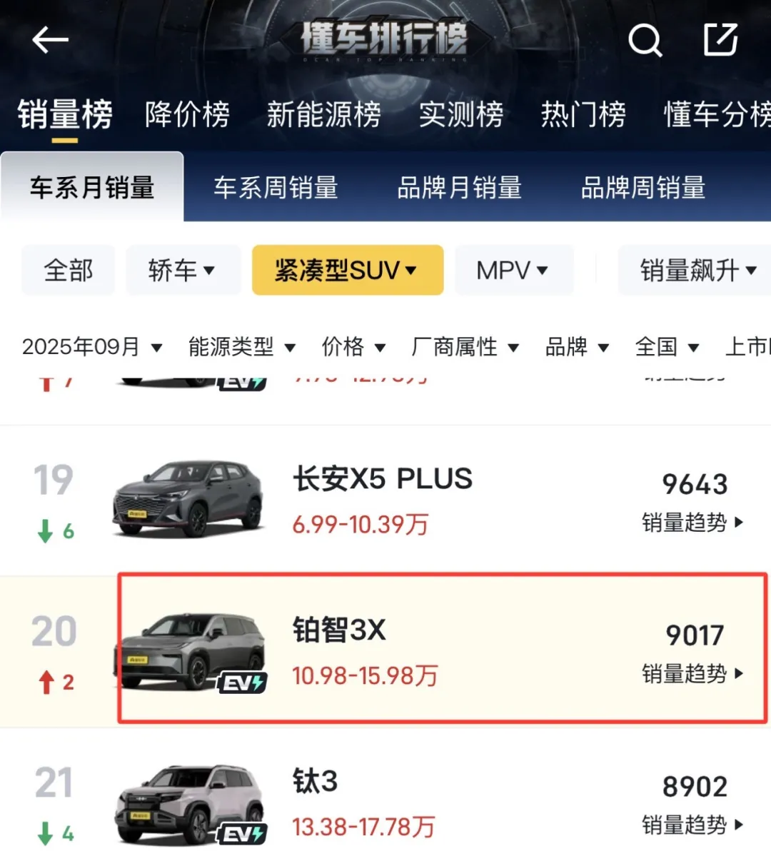 广汽丰田官网显示,目前旗下的新能源车型共有4款。根据懂车帝数据,9月,广汽丰田新能源车型销量最高的为铂智3X,月销9017。如果放在内部对比,铂智这一月销,却是遥遥领先,毕竟铂智4X 9月只卖了109辆。但如果放在整个新能源汽车市场,铂智3X就显得不值一提了。