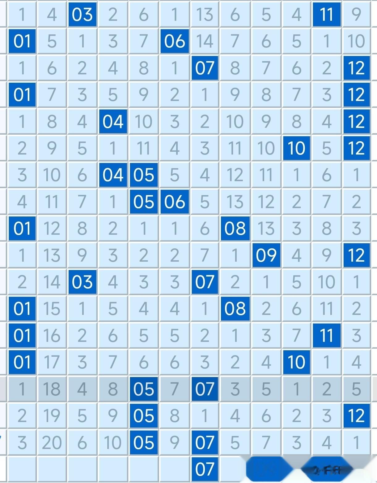 后区号码走势本期开奖号码开出了双奇数号码05-07,其中号码05为二连重号开出,这与午阳在本期选号时的思路一致。不过午阳本期重点关注了05-08,结果没想到奖号05-07在间隔一期之后再次开出。