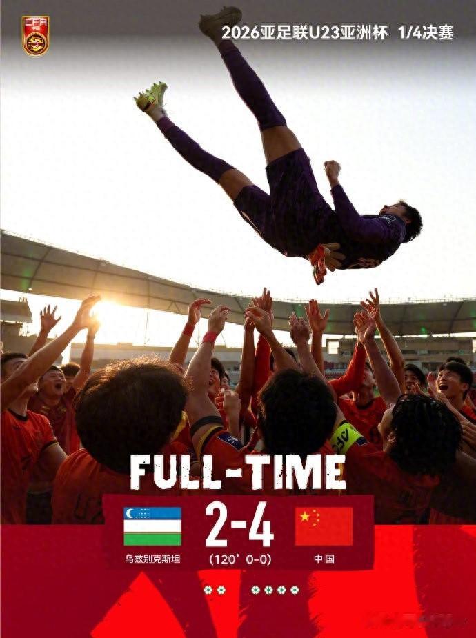 1月17日晚,2026年u23亚洲杯1/4决赛,迎来一场焦点之战!中国男足VS乌兹别克斯坦。双方鏖战120分钟国足0-0战平。最终,通过点球大战4-2淘汰卫冕亚军乌兹别克斯坦队,历史首次晋级四强,这也是2004年之后,中国男足国字号时隔22年再次进入到亚洲赛事的四强。本场比赛,门将李昊全场贡献8次关键扑救,并在点球大战中扑出对手一记点球,成为晋级的头号功臣。