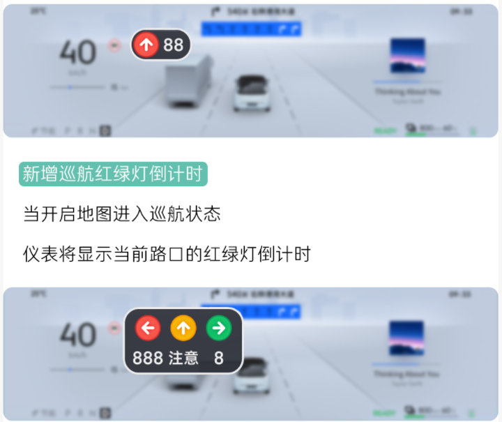 车机界面与细节操作的优化,进一步提升了长途出行的便捷性与安全性。新增的Alive动态壁纸能随车速、电量、挡位实时变化,让座舱更具生命感;多媒体、座椅舒适、能量管理等桌面大卡片,可一键展开快捷操作,减少了功能查找的繁琐步骤。液晶仪表新增导航红绿灯倒计时、电池电量百分比显示,HUD抬头智显则补充了巡航红绿灯倒计时、绿波车速、目的地剩余里程与时间等实用信息,让长途行车中的关键数据一目了然,减少了手动操作带来的安全隐患。