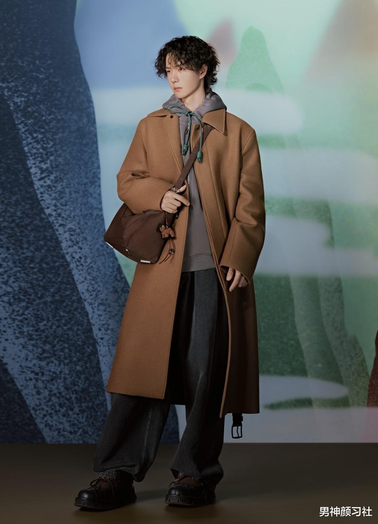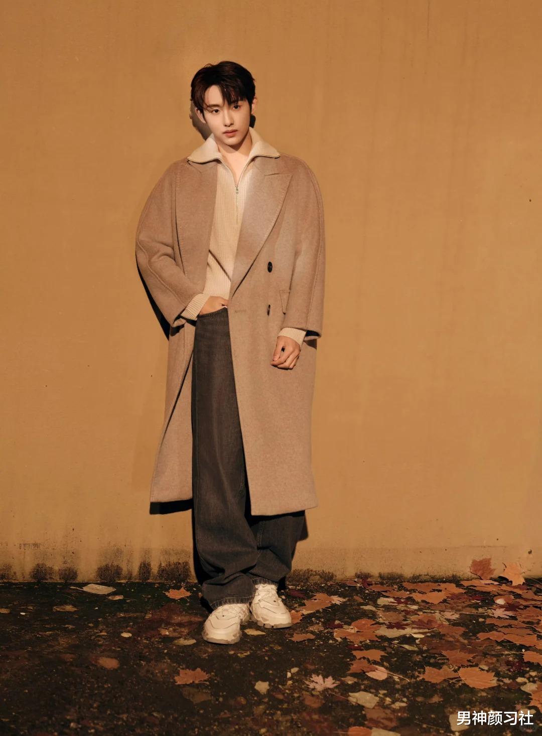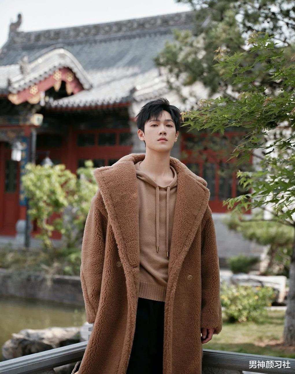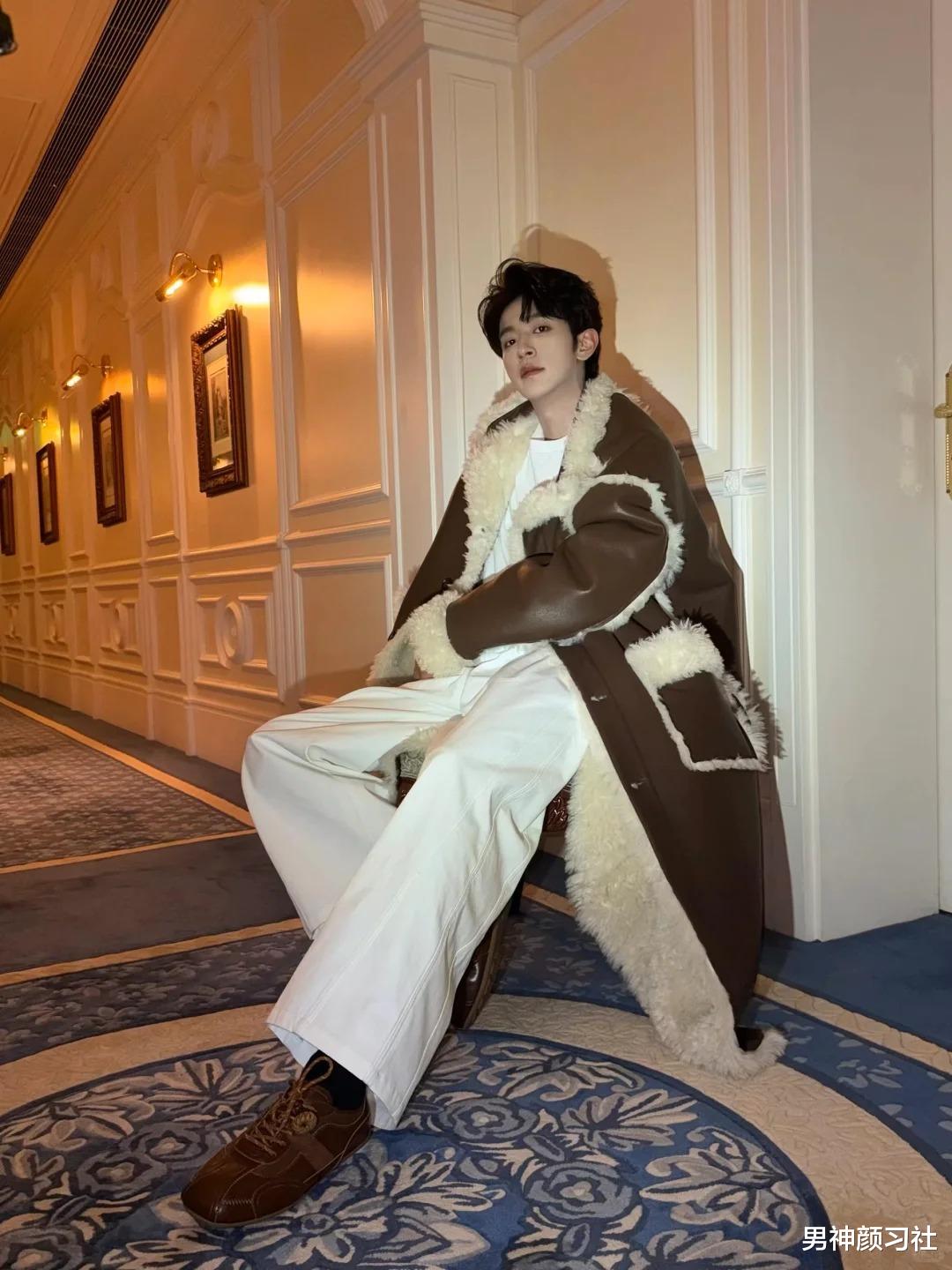 还有一些男生喜欢挑战毛绒绒大衣,这件单品只建议身材比较瘦高的男生穿,否则很容易穿成小土豆。也可以像李昀锐这样,上半身做同色系穿搭,下面换上一条黑裤子。