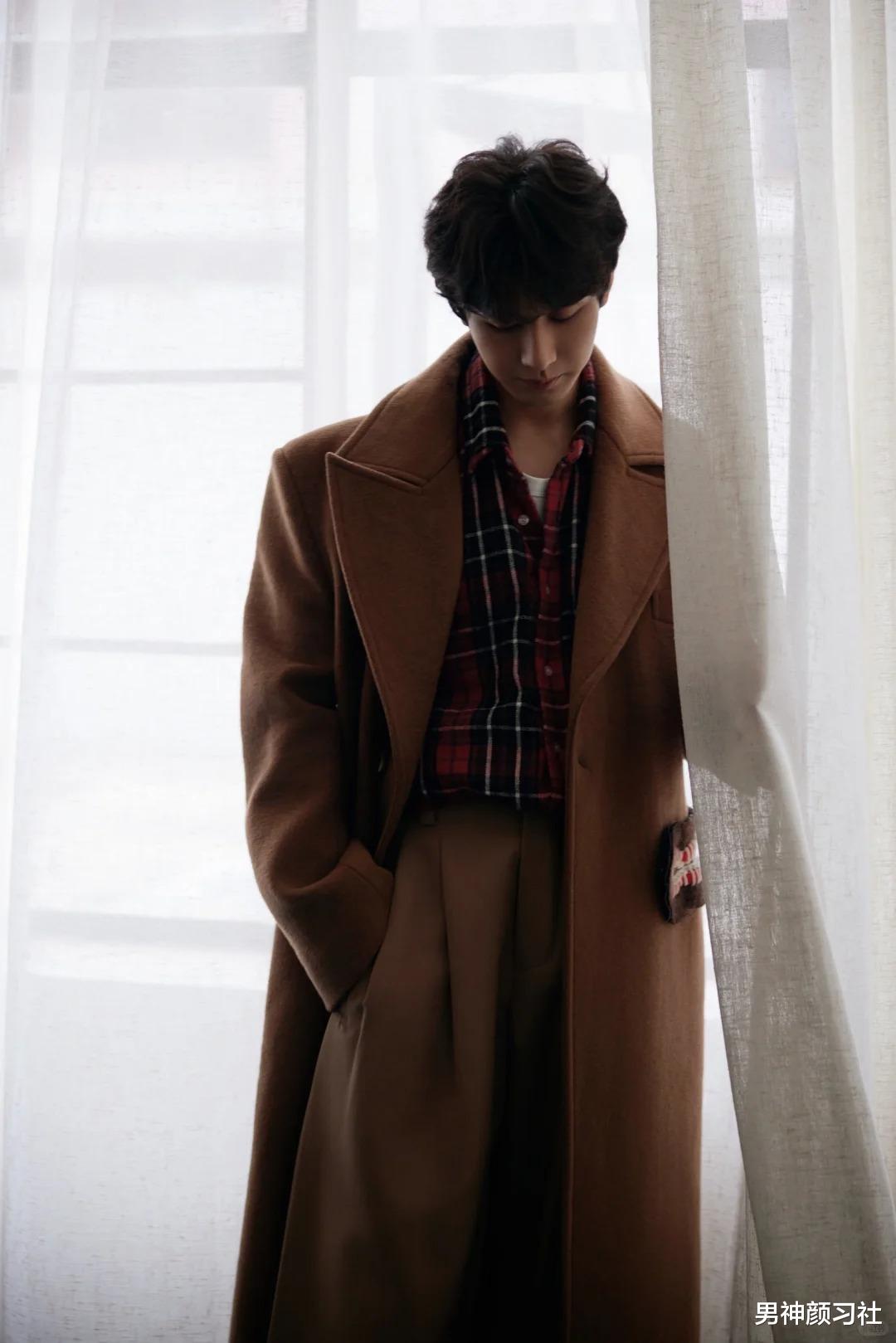 其实衬衫和棕色大衣也是一组很好的cp,成毅就是这么去打扮的。他用了大面积的棕色单品,需要一点亮色系去点亮。此时,平时穿容易土的格子衬衫就很适合拿出来。