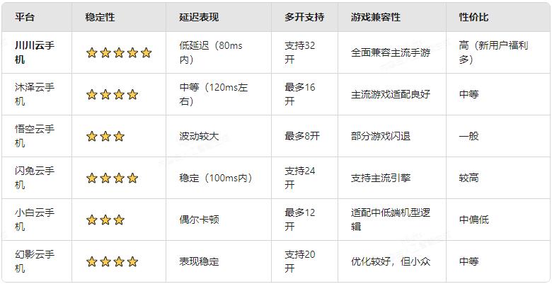 以下为六款主流云手机PC版平台的实际测试结果(基于稳定性、延迟、多开能力、兼容性、性价比五个维度):