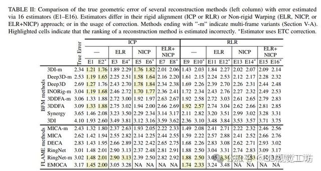 ICP表现最差:基于ICP和Chamfer对应关系的流行误差估计器E1表现最差,在BFM数据上,它错误地对前五种重建方法进行了排名,添加ETC校正(E2)也无法改善这一结果。