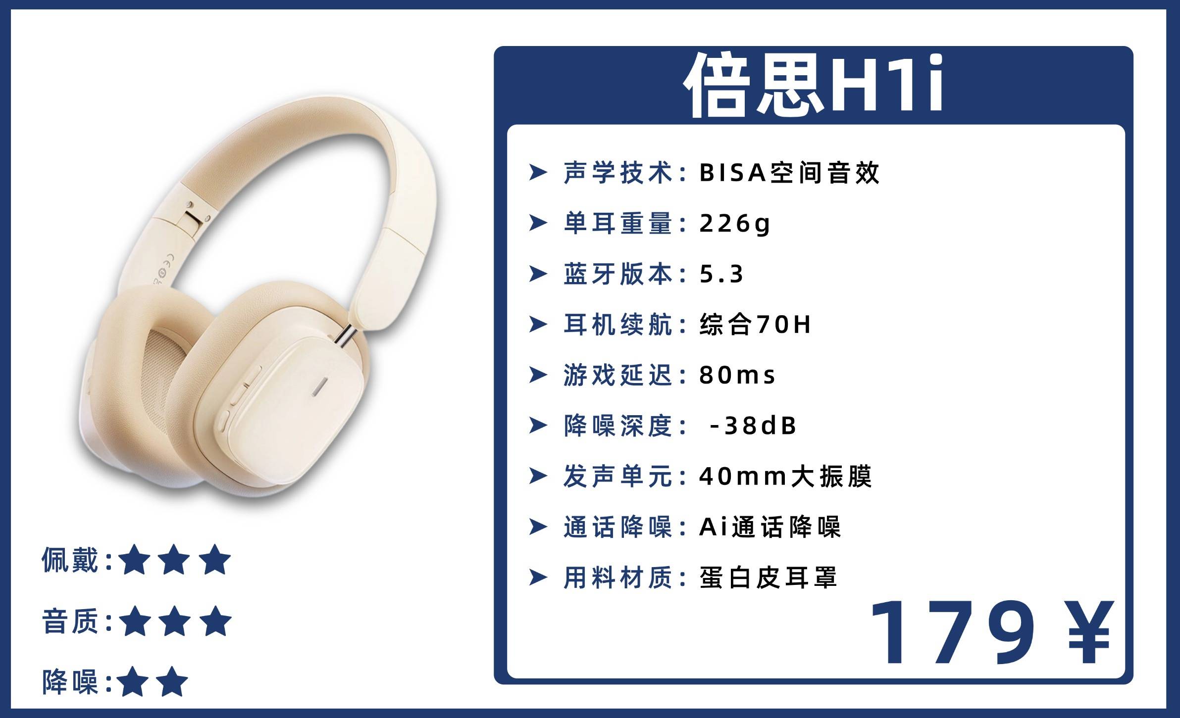 3、倍 思H1i头戴式降噪耳机
