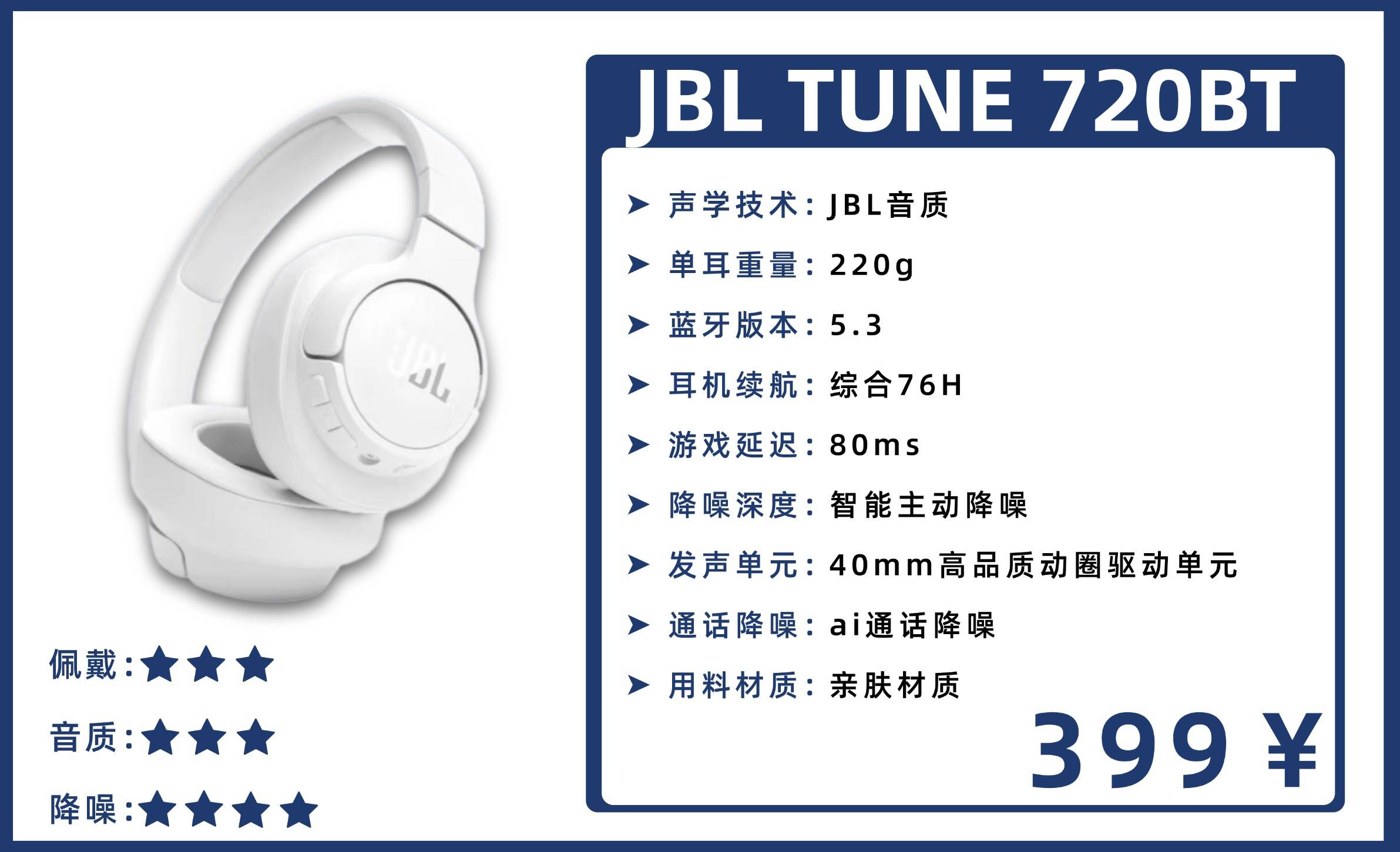 6、J B L TUNE 720BT头戴式耳机