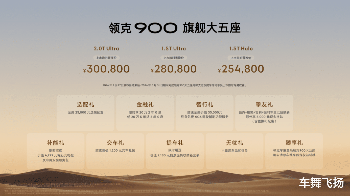 【4月27日,线上】领克汽车旗下全尺寸旗舰大五座SUV——领克900旗舰大五座正式上市。据悉,领克900旗舰大五座共推出 1.5THalo、1.5TUltra、2.0TUltra 三个版型,上市指导价29.98万元至34.58万元,上市限时置换价25.48万元至30.08万元。