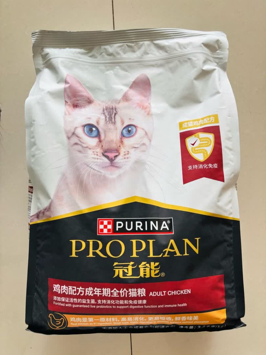 PURINA雀巢普瑞纳是全球知名的宠物护理企业,冠能作为其旗下品牌,不仅面向全球市场,长期走中高端路线。冠能的产品线很全面,除了满足不同需求的猫粮,也有各类狗粮可供选择。在猫粮方面,冠能会针对猫咪的年龄推出幼猫、成猫、老年猫专用粮,同时也会根据功能性需求,开发泌尿道护理、肠胃护理、体重控制、健肤美毛等类型的猫粮,狗粮的细分思路也和猫粮类似。这款成猫鸡肉猫粮的原料包含15%冻鸡肉、14%鸡肉粉,还有玉米蛋白粉、小麦、大米、鸡油等。粮粒为三角形膨化样式,包装设计上,冠能多数猫粮以黑白色为主色调,搭配其他颜色,整体看起来很高端。