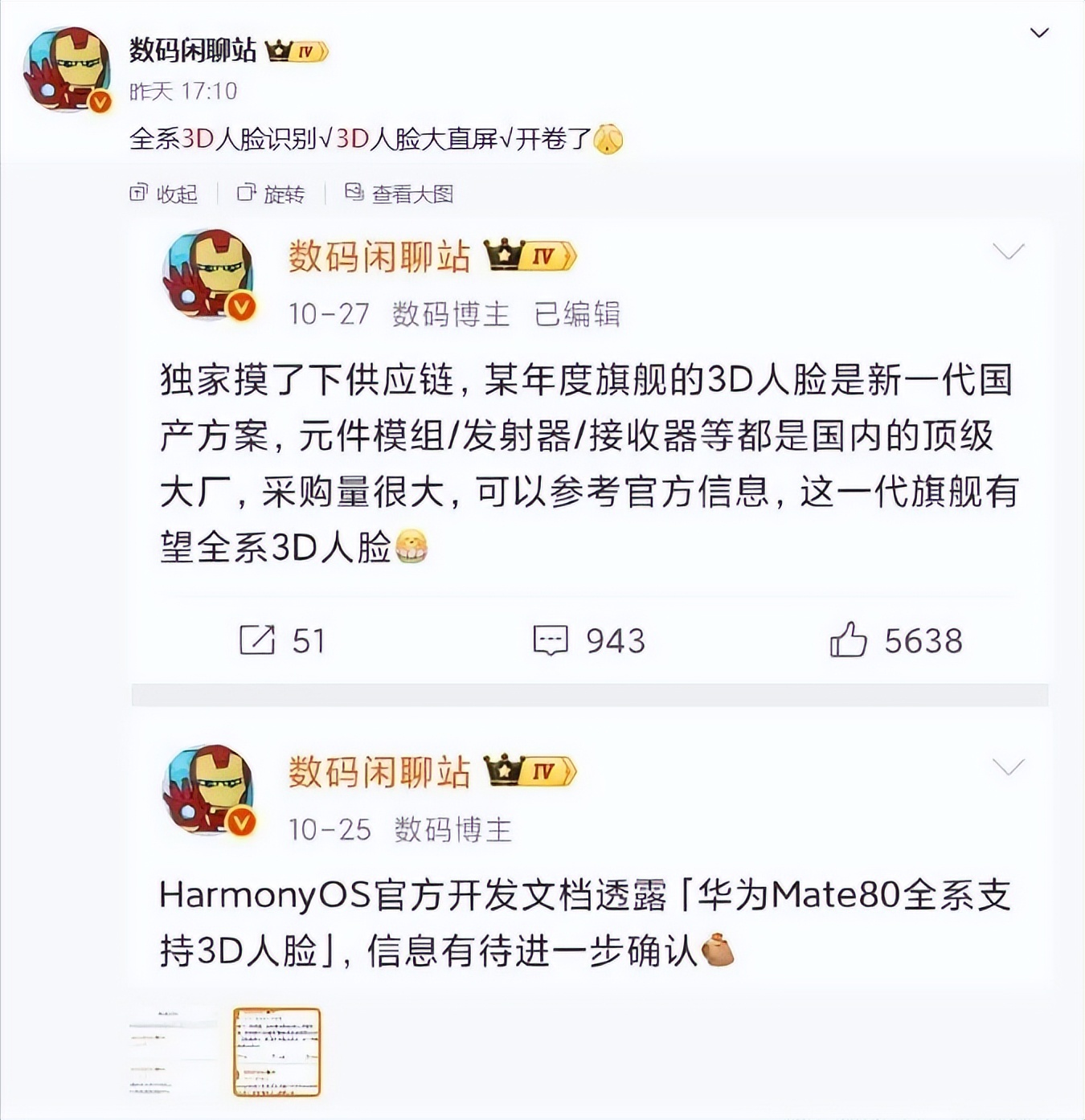 过去,3D结构光人脸识别一直是Pro系列及以上机型的专属。但这一次,Mate80标准版也将搭载这一功能,实现全系覆盖。这对于追求实用又重视安全解锁体验的用户而言,无疑是一大福音。结合此前曝光的“三打孔”设计,华为似乎在人脸识别技术的成本控制与普及化上取得了新进展。