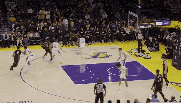 NBA常规赛,湖人主场迎战热火的比赛正在进行中。比赛的第一节,斯马特死亡缠绕完成抢断,背传助攻八村垒快攻扣篮得手。