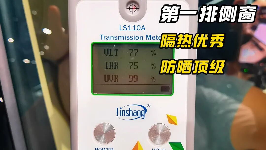 尚界H5 2025款第一排侧窗测下来,红外阻隔率(IRR)为75%,紫外阻隔率(UVR)有99%,这组数据在市面上横向对比的话,算是中档偏上。不过,透光率(VLT)仅为77%,偏低,透光冗余还剩下7个百分点,要想贴膜的话,可以选择的产品其实不多。