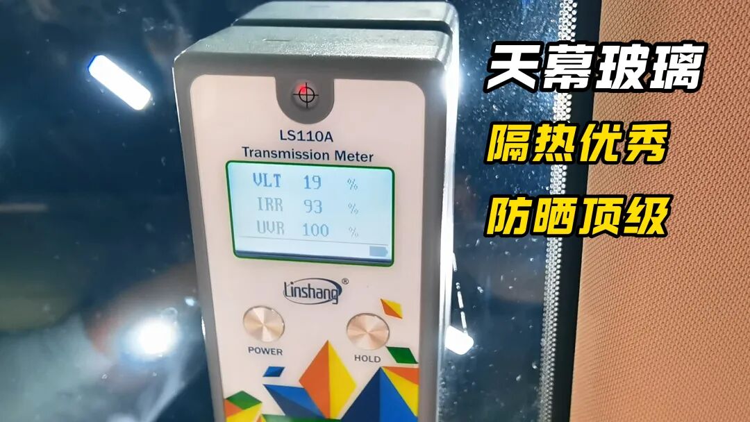 压轴的是尚界H5 2025款的前挡玻璃,紫外阻隔率(UVR)为100%,红外阻隔率(IRR)75%,也算是过得去。透光率(VLT)达到79%,给日后的贴膜留下了一定的透光冗余。