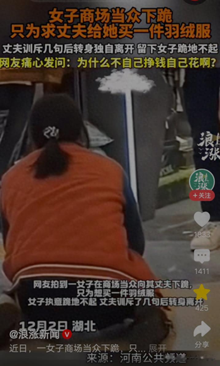 忽然,静姝向鹏涛下跪,再次恳求鹏涛:“给我买件299元羽绒服。”