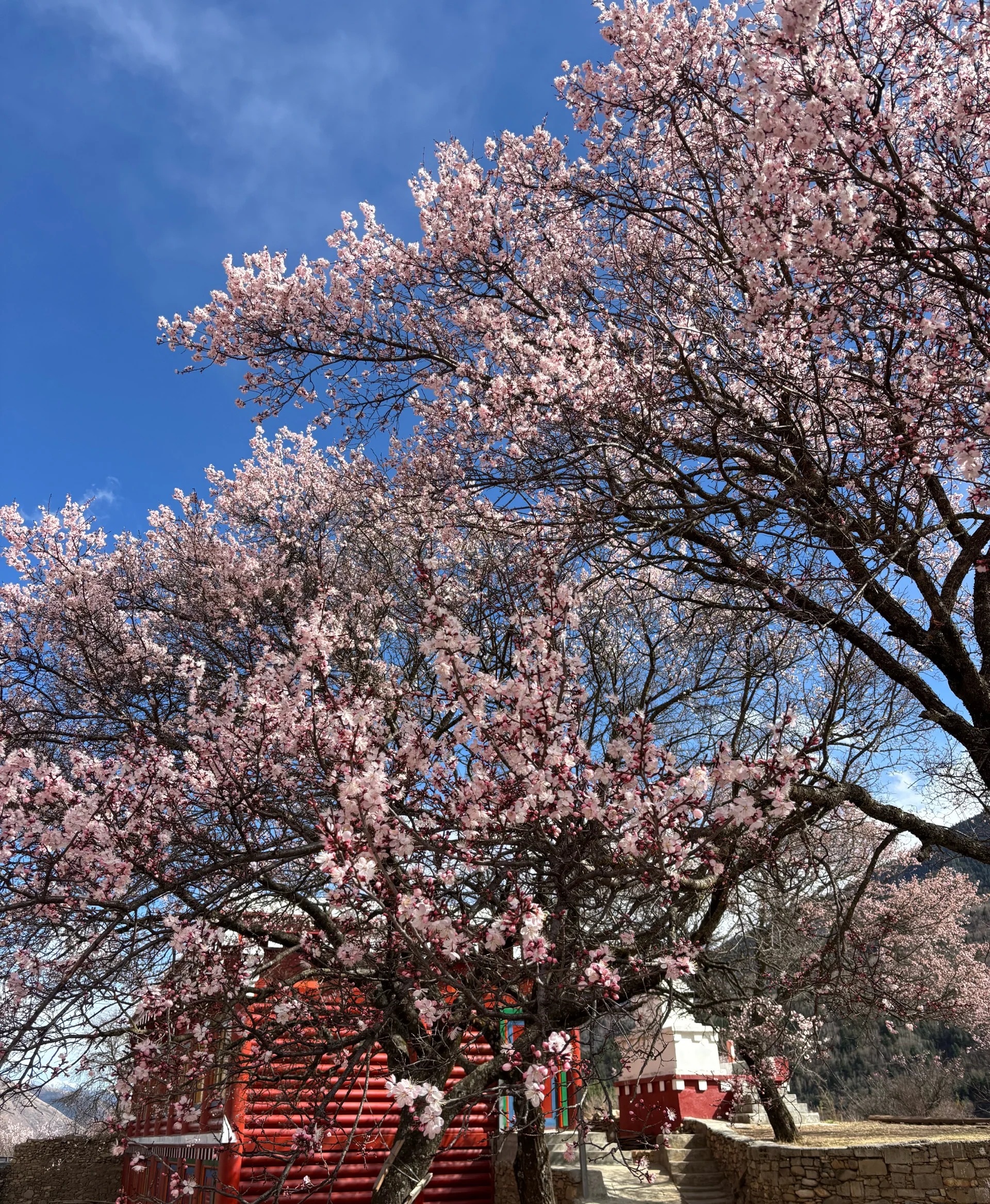 📍孔色麻湾村:杏花最多的((杏花核心村,古杏树+藏寨+雪山同框)步道好拍。机位:村口大杏树、河畔步道、藏寨屋顶、麦田远景