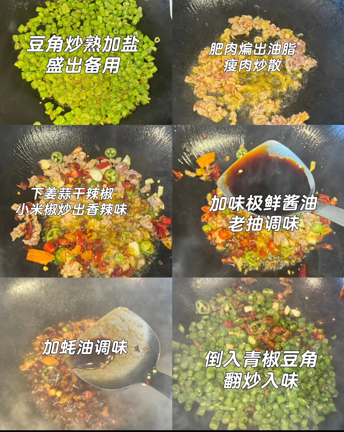 当所有的调味料在锅中完成第一次融合后,便可以将之前焯好的豆角段和煸好的肥肉丁一同倒入锅中。开大火快速翻炒,让豆角充分吸收锅里的酱汁和油脂。这时候的豆角,已经从原本的寡淡变得油润饱满,每一根都裹上了肉末的香气和辣椒的鲜辣。翻炒的时间不宜过长,大约一分钟左右,待豆角完全入味,即可关火出锅。