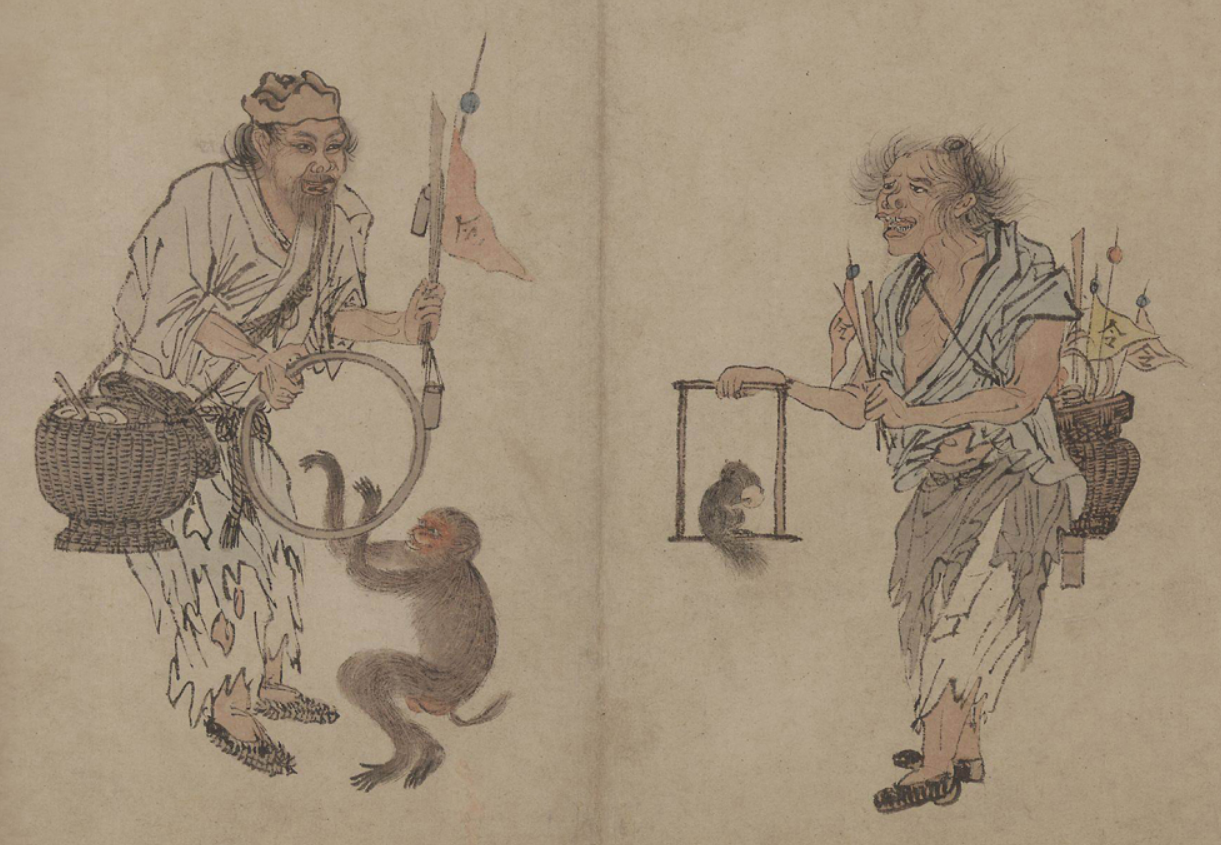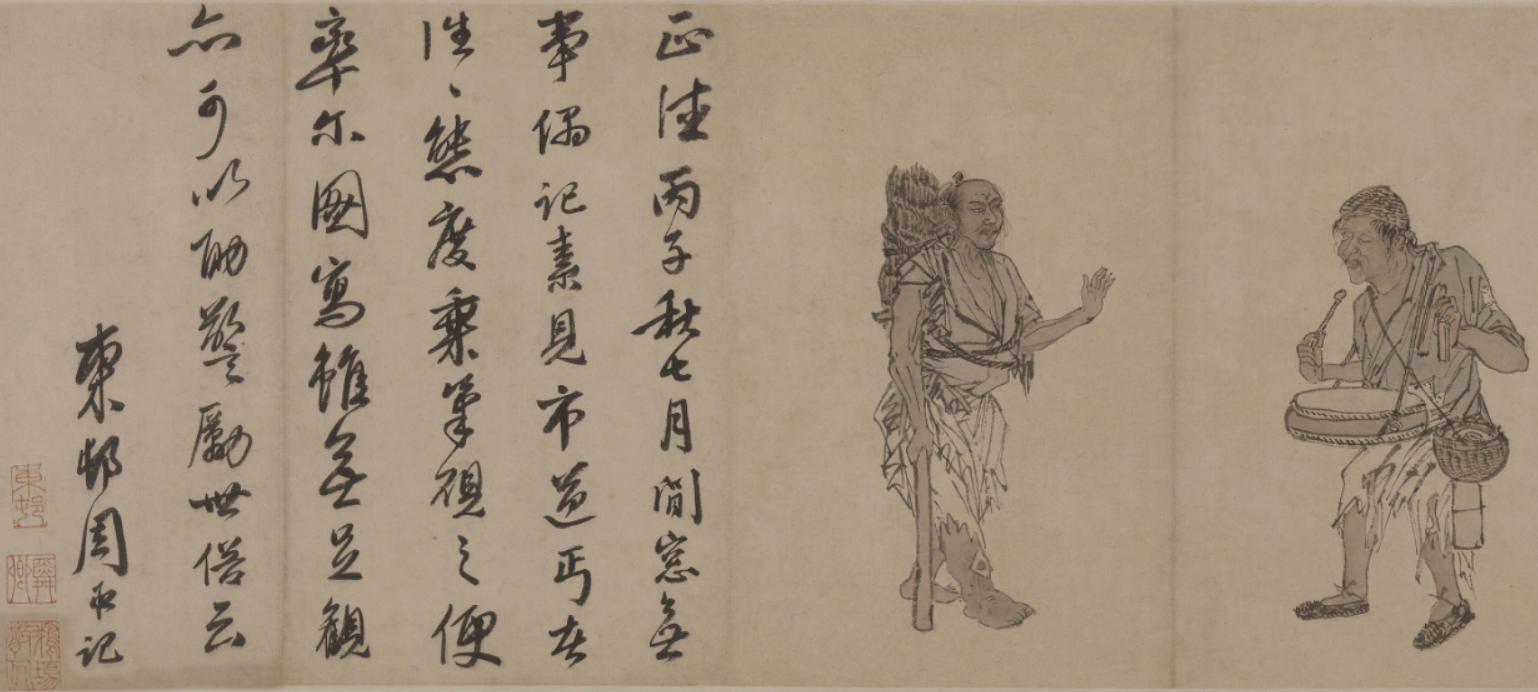 机缘之下,仇英得识艺术界大佬、大他三十岁的文徵明。文徵明被这位贫困少年的天赋、人品打动,多加指点、提携,还推荐他拜画家周臣为师,成为唐伯虎的小师弟。周臣擅画人物和山水,其《流氓图》很有名。此流氓并非今天的地痞“流氓”。主角是12名灾民、乞丐、道士、僧人、卖婆等,以耍猴、耍松鼠、耍蛇等卖艺谋生。