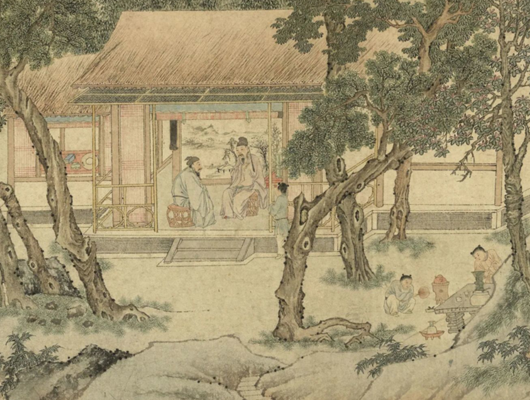 画中,主客对坐品茗,童子或烹茶,或送书卷。轩斋、屏风、几案、板桥等,线条严谨,却韵味雅逸。仇英以浪漫主义手法,融入山水元素,为园林注入“野趣”,凸显了士大夫寄情自然的卧游之乐。