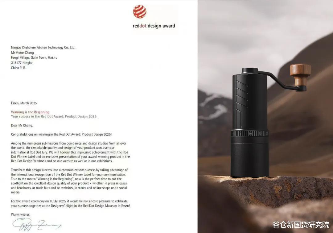 4月份,《谷仓新国货加速营》24期学员宁波厨聚厨房科技有限公司传来喜讯,其与谷仓新国货加速营共创产品“电动便携式咖啡冲泡研磨一体机”获得2025年红点设计奖。