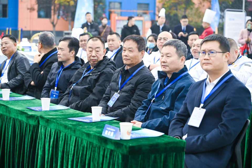 西安市商务局副局长郑炜,陕西省商务厅商贸服务业处副处长王朝军,陕西省工商联会员部副部长段刘华,陕西省市场监督管理局四级调研员赵宏凯,西安市商务局商贸服务业处处长刘宏涛、二级调研员赵耕,西安市职业技能鉴定中心主任罗曼、西安市人社局职业能力建设处调研员贾玉峰、蓝田县经贸局副局长杨龙等政府部门领导;陕西省餐饮联合会驻会会长党小兵、陕西省食材供应链协会执行会长梁国义、宝鸡市餐饮饭店行业协会会长刘柯利、陕西省小吃协会副会长张进、铜川市烹饪餐饮行业协会常务副会长解锋、咸阳市饭店烹饪餐饮行业协会常务副会长兼秘书长刘伟 、汉中餐饮与饭店协会副秘书长刘杰、蓝田厨师品牌联合会会长王涛、蓝田烹饪协会会长段均彦、大荔县餐饮协会会长吴兢等省、市、县商协会领导;承办单位陕西省餐饮业商会会长杨忠,党支部书记杨忠良,常务副会长兼秘书长杨爱婷,常务副会长、西安师苑后勤服务有限责任公司董事长刘选平,常务副会长、西安亿阳快餐服务有限公司董事长周身强,常务副会长、陕西面辣子饮食文化集团董事长周胜利,副会长王浩、徐长安、左汀,驻会副会长兼副秘书长孙东海、于晓阳,监事高义、刘军利;比赛所在地西安新东方烹饪技工学校校区主任朱毅、创新中心主任李辉,以及大赛裁判组、监理组成员,参企业代表及选手、新闻媒体代表等400余人参加了开幕式。