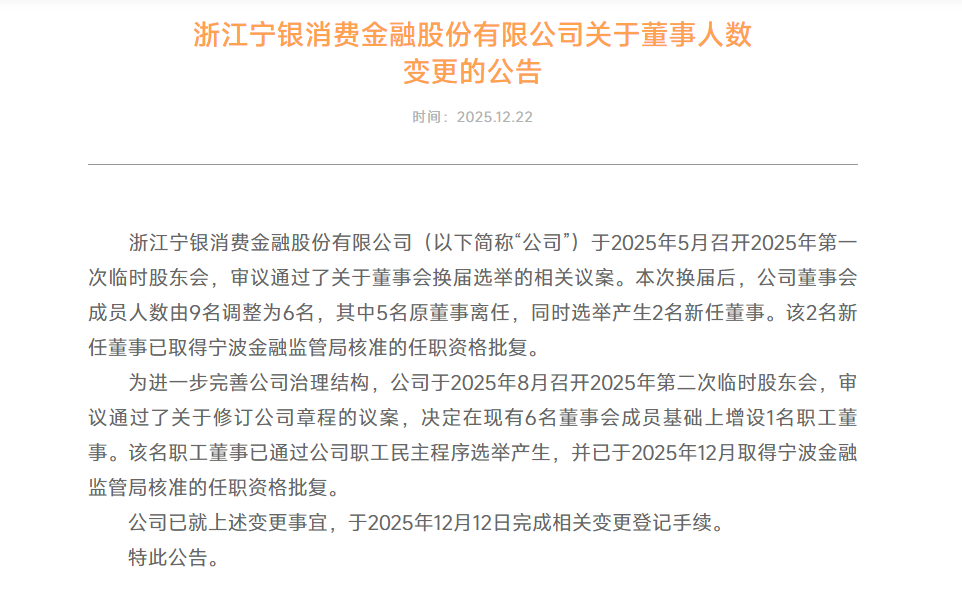 无独有偶,宁银消金同样在2025年底,完成了重大的高层人士调整。在2025年公司的第一次临时股东会上,完成了董事会换届选举,董事会成员的人数已从9名压缩至6名。这次选举中,有5名原董事离任,同时选举产生2名新董事。而到了第二次临时股东会上,为了进一步完善公司的治理结构,又增设了1名职工董事。这一系列的人事调整,在2025年12月时已全部获得监管部门批复,并完成了变更登记手续。