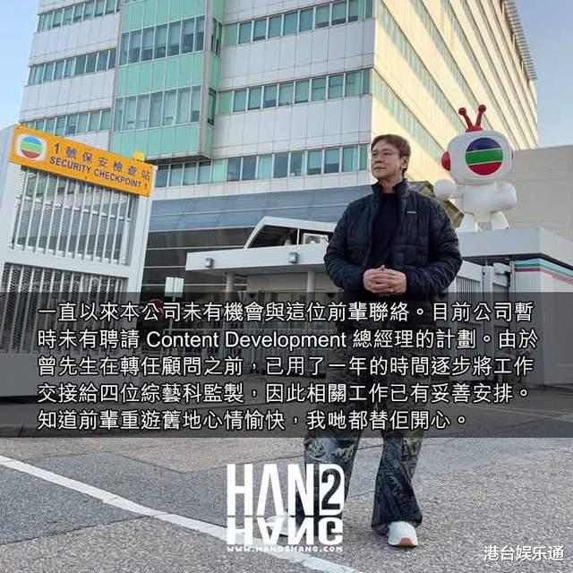 “一直以来本公司都未有机会和这位前辈联络。目前公司暂时未有聘请内容营运业务总经理的计划,由于曾先生在转任顾问之前,已用了一年的时间将工作交接给四位综艺科监制,因此相关工作已有妥善安排。知道前辈重游旧地心情愉快,我们也替他开心。”