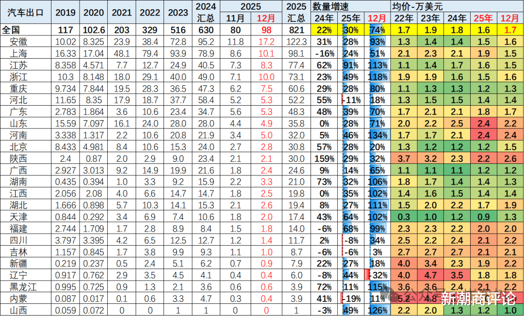与上年相比,河北、四川、吉林、内蒙古出现不同程度的下滑。与之形成鲜明对比的是,江苏以91%的同比增速成为全国增长最快的汽车出口省份,浙江、河南、天津、福建、辽宁、山西的涨幅均超过四成。