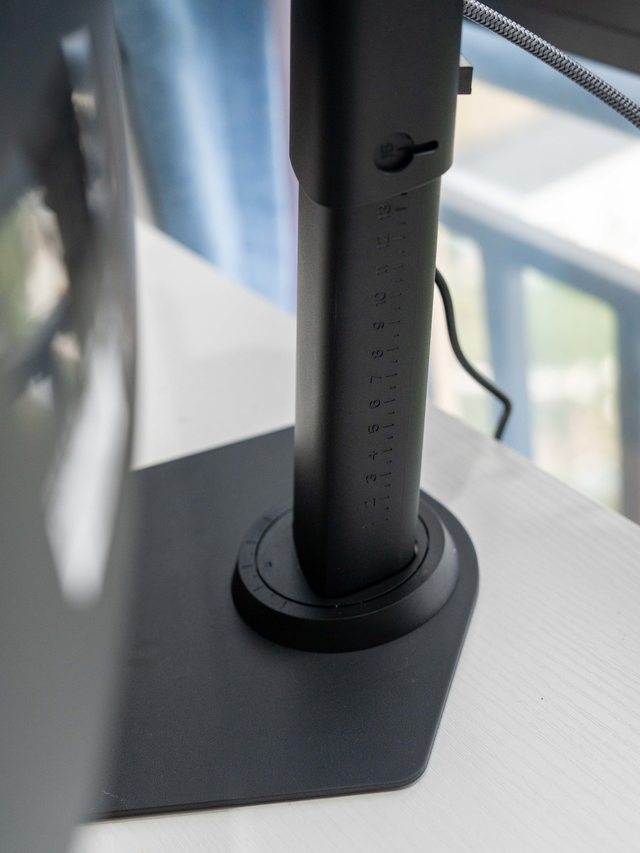 套筒结构的支架支持升降、俯仰以及左右垂直旋转。除了常规人体工学支架的功能以外,支架上印有刻度,非常适合我这种强迫症患者,每次调整完都觉得回不去之前的那个位置。