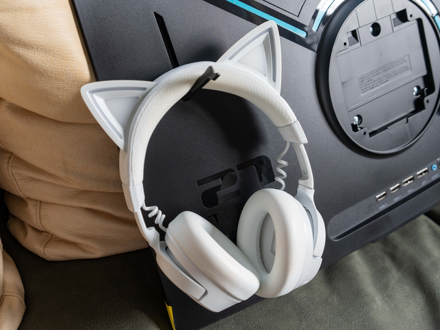 而背面的左上角,提供了一个折叠式耳机挂钩,方便玩家收纳耳机。相较于支架后方的常规设计,泰坦军团G2785S的耳机挂钩不需要站起来就可以轻松使用,十分好评。