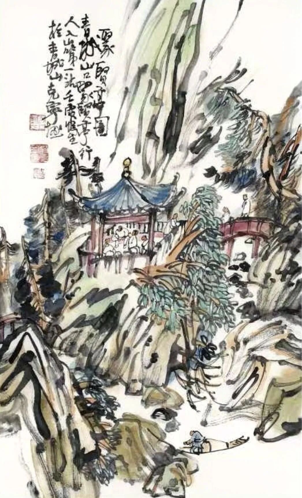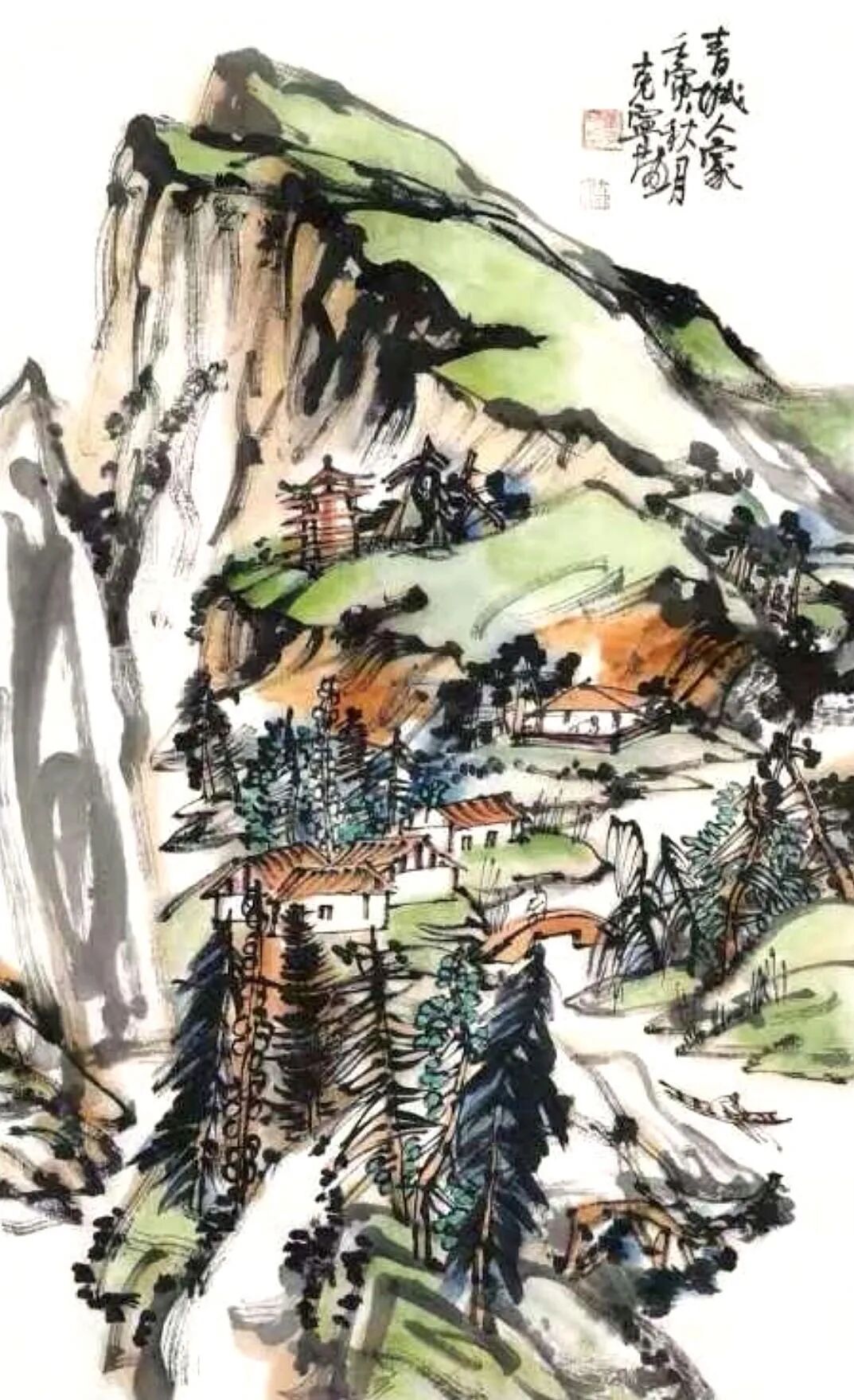 画家刘克宁的绘画追求並不止於人物画和历史长卷的创作,画家传统文化底蕴深厚,功力扎实,技法全面,其山水和花鸟画也都有独特的个性面貌。在画家的个人认识中,山水花鸟和人物画有着共通的原理,都需要用传统文化支撑画面去创造意境,都需要用笔墨去制造符号元素。山水花鸟和人物的技法上相互打通和相互产生的影响,也会使人物绘画用笔更加丰富。刘克宁《青城山》系列山水画,在旅居青城山写生基础上画出几十幅青城山景,书法入画,落筆直取,以写代皱,山韵山景,直落其中,省繁杂,简皱点,以线代皱,精写提炼,色墨结合,出於传统而又别於传统,一种新的气韵新的形式出现在山水画坛,给人以和山川交流对话的感觉
