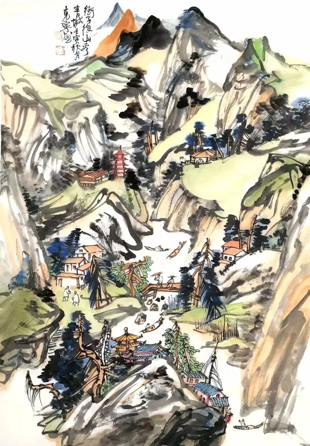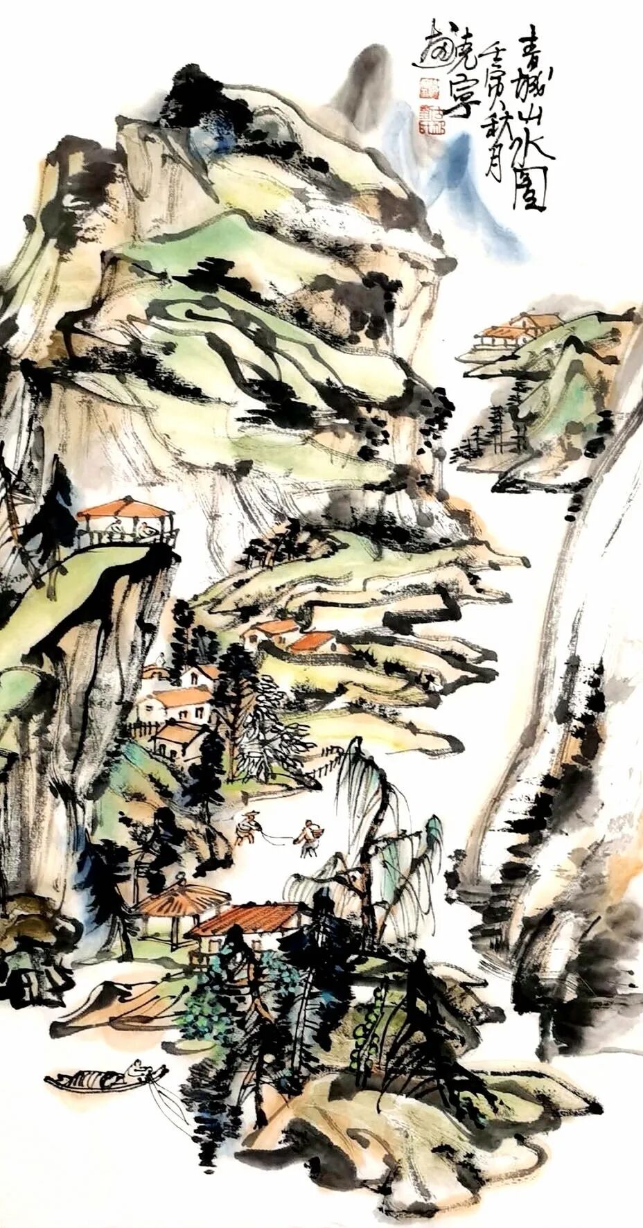 刘克宁画荷花画人物皆以大写为主,以色代墨没骨直取,酣畅淋漓,重落园葉淡写荷,中线勾蕊别存特质,配以人物或东坡或仕女孩童,气韵生动,质朴可爱。而在山水中画家寄情天地,纵横开合,取其青城之精神,拍岸借石造山川,给人以酣畅淋漓之意境。再现川地山清水秀宜居宜行之面貌。纵观其画不论山水,花鸟和人物皆在气韵律动,意境优美之中。六法之要贵在气韵,刘克宁的绘画有一种与生俱來的悟性和灵动贯穿在绘画作品里,产生了生动的气韵和境界,行形成完整的筆墨形式和作品内容的统一。这正是优秀的中国写意绘画的文化特质,也是一个画家的创造和追求,简言之,刘克宁的艺术彰显着传统文化的审美和当今时代意识相结合的鲜明的时代特征。