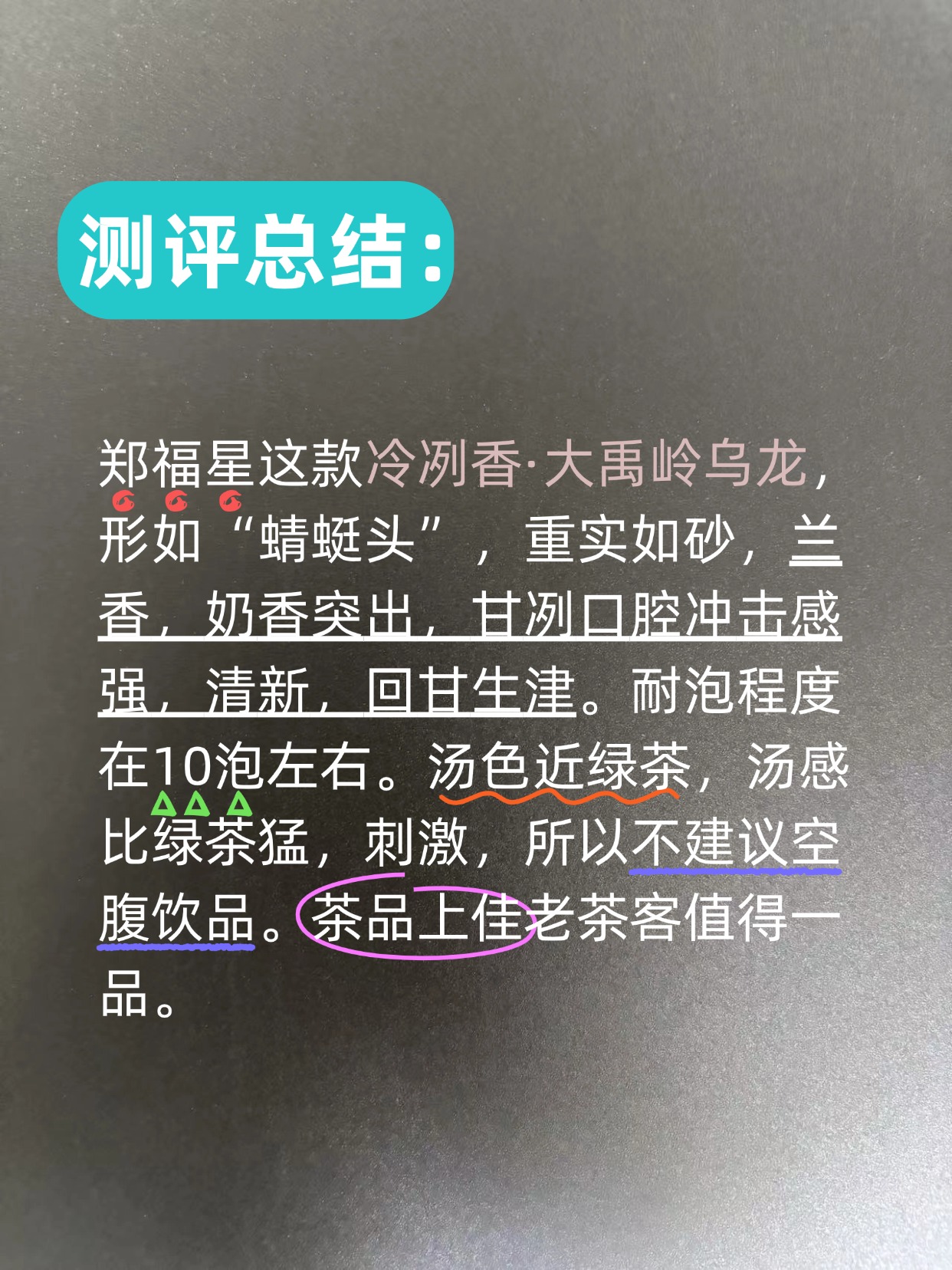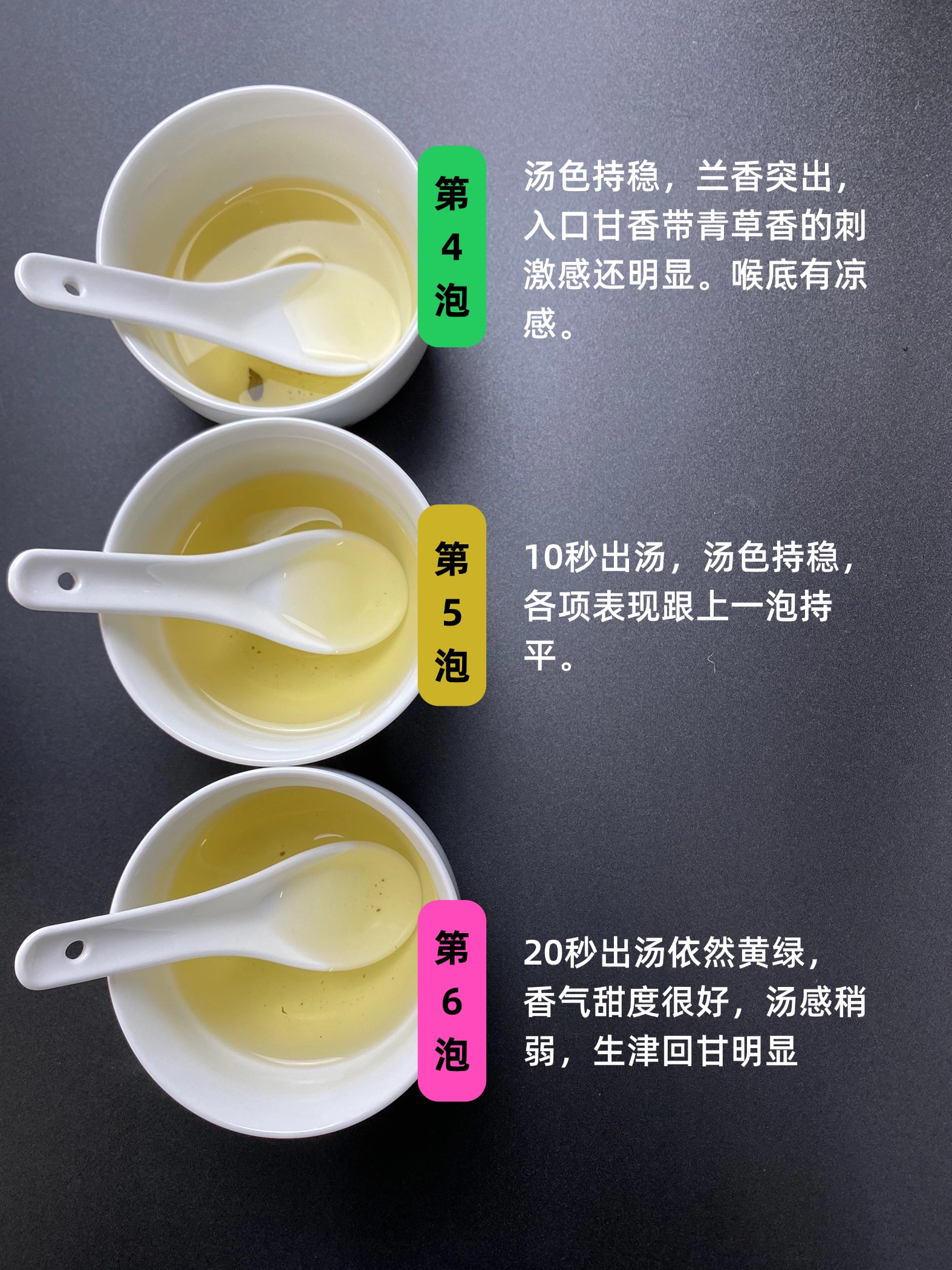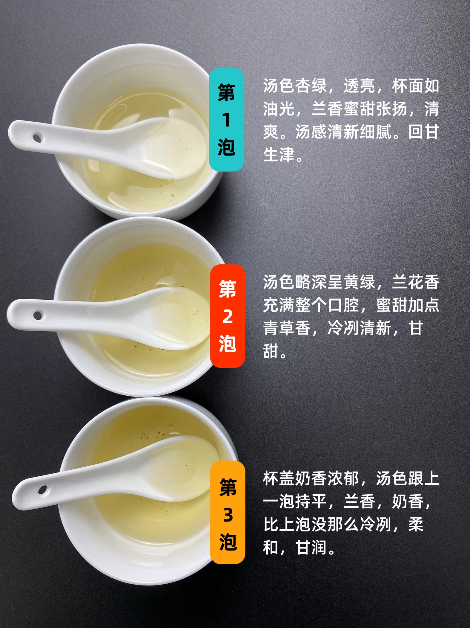 第一泡,汤色杏绿,透亮,杯面如油光,兰香蜜甜张扬,清爽。汤感清新细腻。回甘生津。