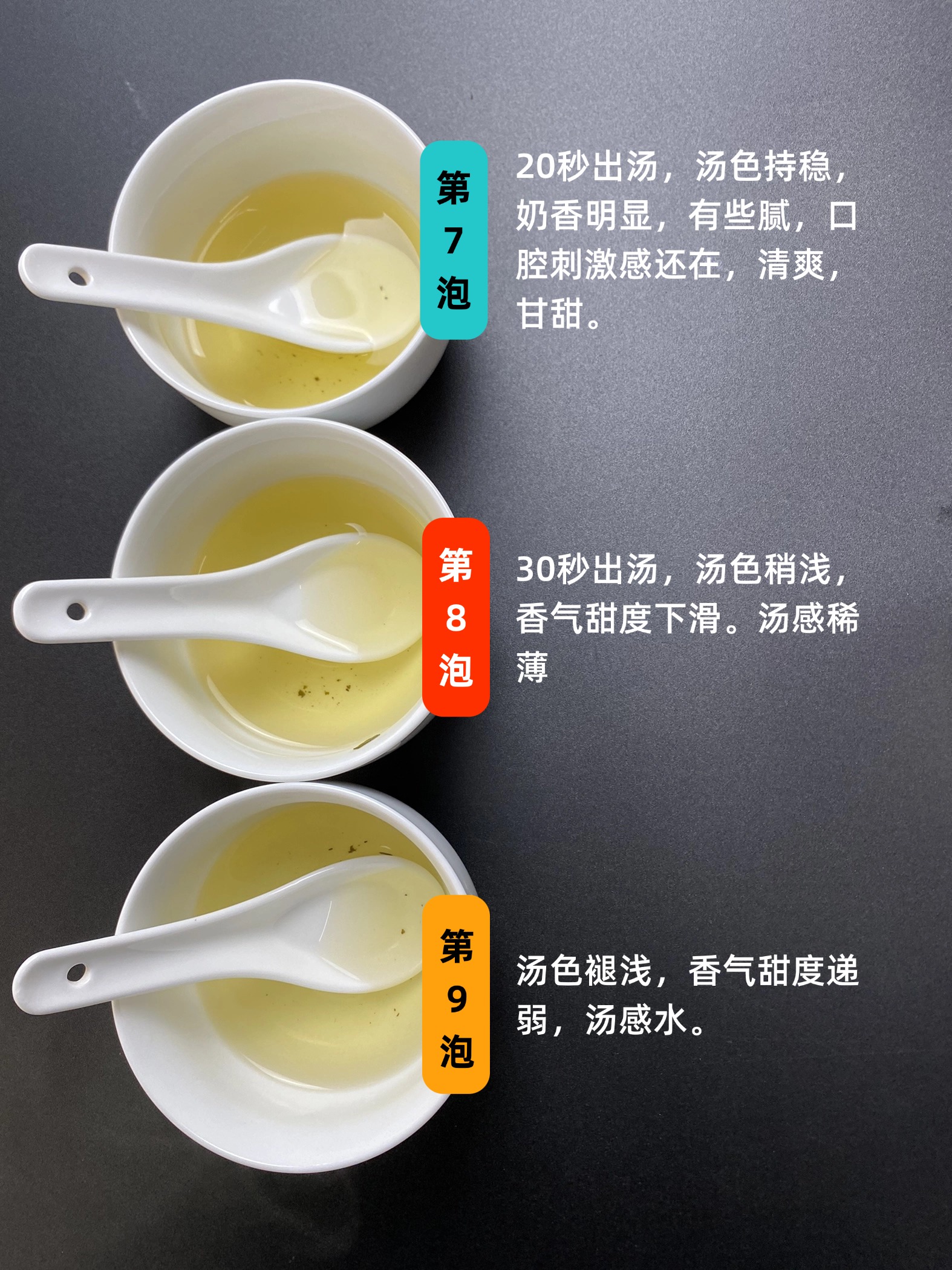 第七泡,20秒出汤,汤色持稳,奶香明显,有些腻,口腔刺激感还在,清爽,甘甜。