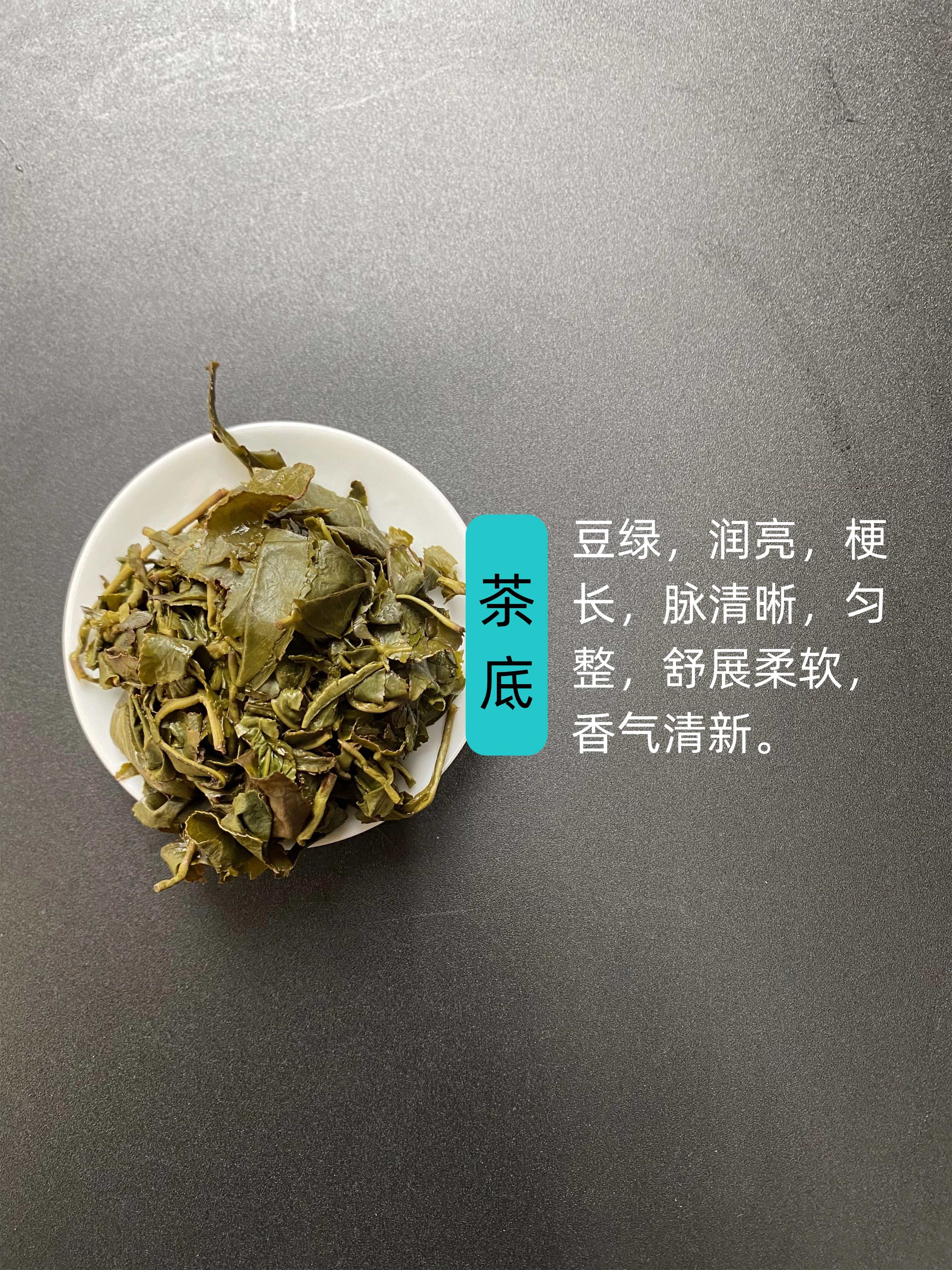 叶底,豆绿,润亮,梗长,脉清晰,匀整,舒展柔软,香气清新。