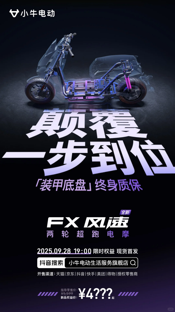 担心电摩骑得不稳、用得不久?全球高端智能电动车领导品牌小牛电动FX风速给足安全感!车身净增3.7公斤强化钢材,扭转刚度提升74.8%,更有终身质保「装甲底盘」!这款3000W高功率电机、4K价位的电摩将在9月28日19:00迎来新品首发,福利更给力!抖音「小牛电动生活服务旗舰店」直播间,狂抽10台半价车,性能、价格、质保、福利全都在线,小牛FX风速真的是一步到位!