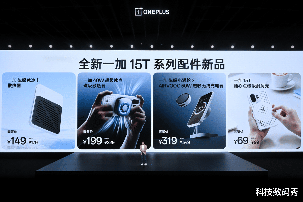 本次发布会上,一加还带来了一系列“又小、又强、又帅、又好玩”的全新专属配件:包括全行业首创的超薄磁吸风冷散热器「一加磁吸冰冰卡」、拥有市面最高 40W 功率的「超级冰点磁吸散热器」、新增桌面支架与多模式调节的「小涡轮 2 代」磁吸无线充,以及质感十足的专属配色「洞洞壳」。以上配件与手机搭配购买,均可享受立减 30 元的套餐专属优惠。