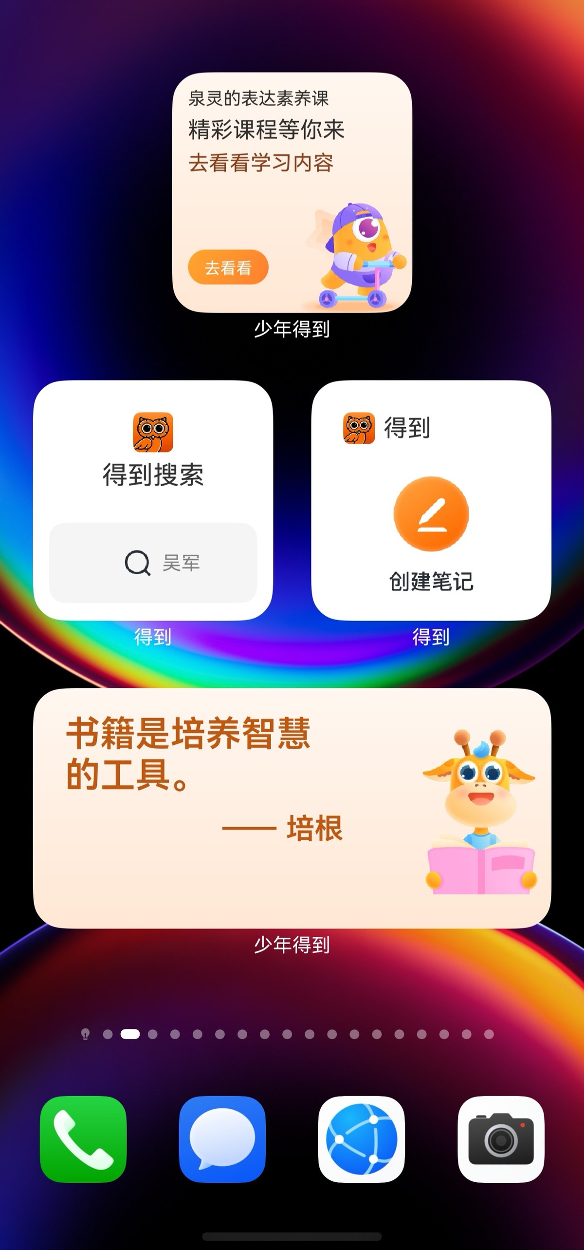 给儿子用的“少年得到”,卡片设计更贴合孩子的使用习惯,和我的“得到”卡片操作逻辑相似,却更简洁易懂。不用繁琐的步骤,点一下桌面的少年得到卡片,就能直接展开他的专属课程,一键拉进学习场景,不用在APP里翻来翻去找课程,大大减少了他分心的机会。以前喊他学习,磨磨蹭蹭十分钟还没打开页面,现在指尖一点就能开始,慢慢也就养成了主动点开学习的习惯。
