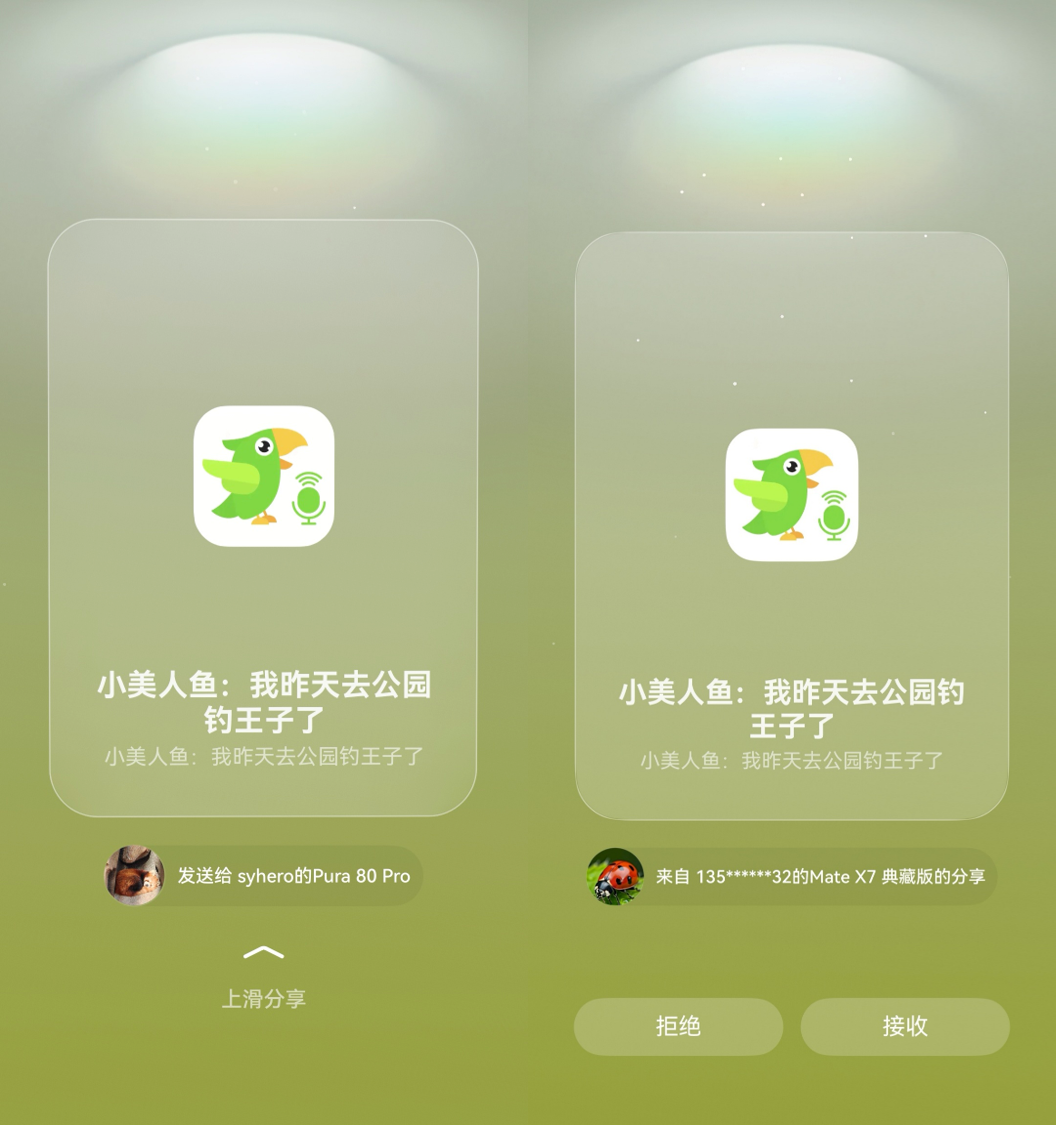 接孩子放学回家,班里同学的家长还通过鸿蒙版英语趣配音APP,用“碰一碰”功能给我分享了英语课程,说这个课程提升特别大,我打算让我儿子也试试,说不定学完也能有进步。