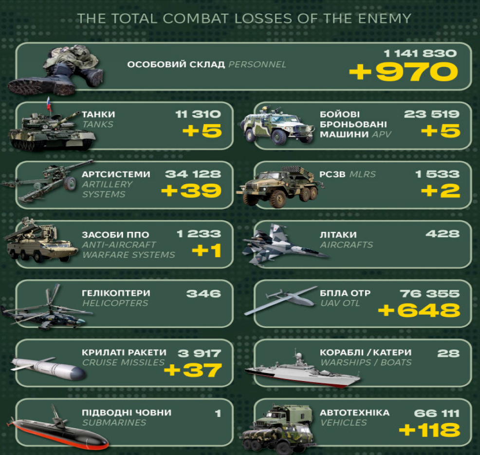 乌总参公布的昨日战果,歼敌(毙+伤)970人。