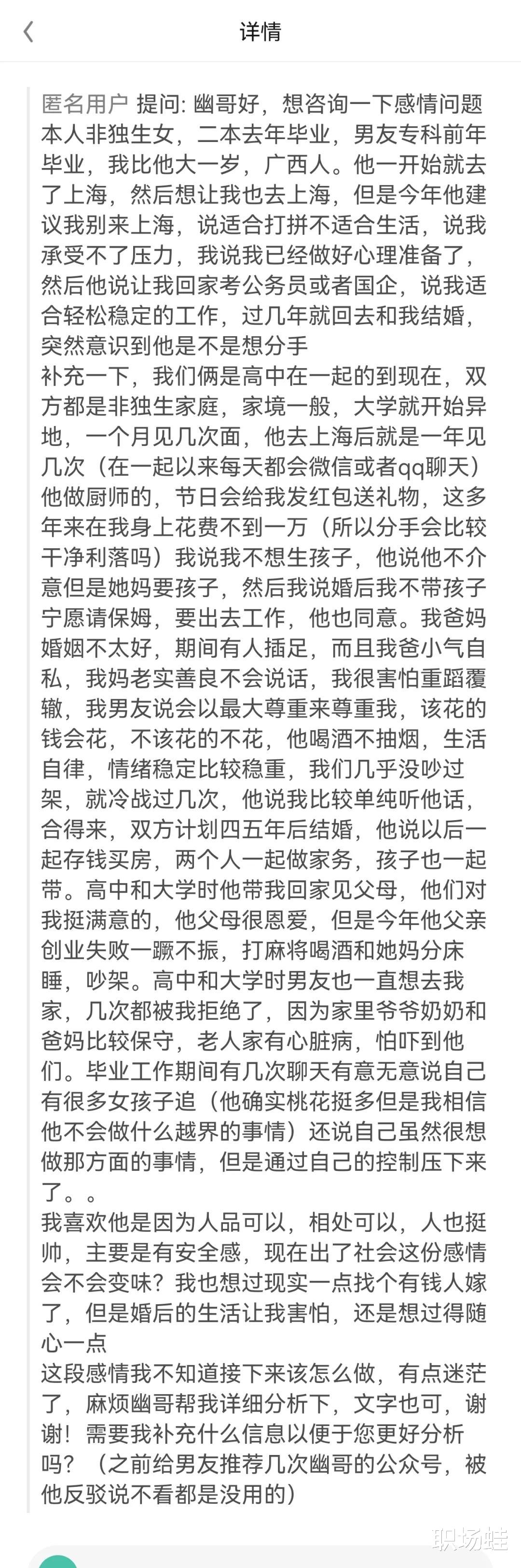 “但是今年他建议我别来上海,说适合打拼不适合生活,说我承受不了压力,我说我已经做好心理准备了,然后他说让我回家考公务员或者国企,说我适合轻松稳定的工作,过几年就回去和我结婚,突然意识到他是不是想分手”