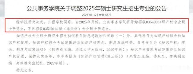 自2025年开始,不再招收035101法律(非法学)专业硕士研究生。自2025年开始,公共事务学院将开始招收035400知识产权专业硕士研究生,初试科目:思想政治、英语(一)、知识产权综合和知识产权管理。