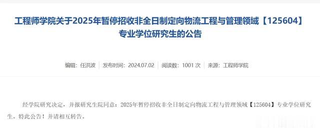 ●「浙江大学」工程师学院2025年暂停招收非全日制定向物流工程与管理领域【125604】专业学位研究生。