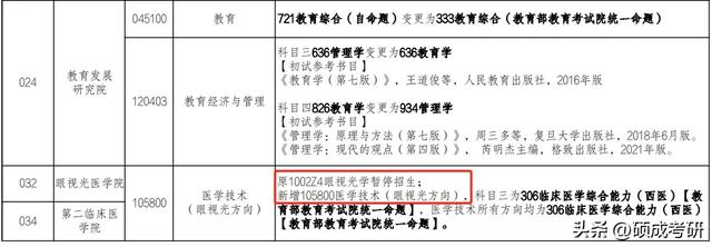 眼视光医学院和第二临床医学院发布公告,原1002Z4眼视光学暂停招生;新增105800医学技术(眼视光方向),考试科目三位306全国统一命题。