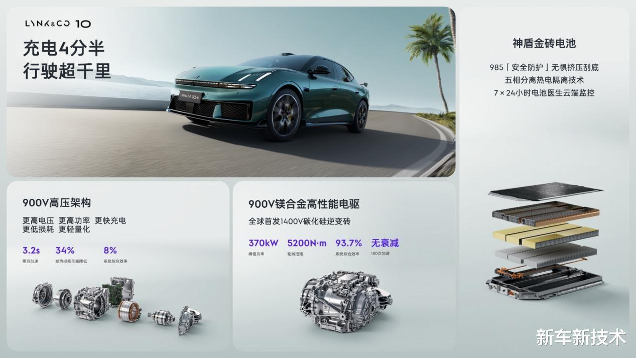 纯电市场竞争早已从续航比拼,转向补能速度、能效、安全的三维竞赛。领克10 系列跳出 800V 主流架构,直接搭载900V 高压平台,搭配两款神盾金砖电池,把补能效率推至量产车新高度。