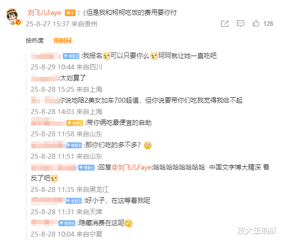 同时还有网友表示真的可以吗,如果可以自己先包两天!但是刘飞儿此时发现自己可能有点赔了,补充了一下:但我和柯柯吃饭的费用要你付。结果网友纷纷吐槽:本来我都心动了,突然觉得我的钱包还是不够厚。