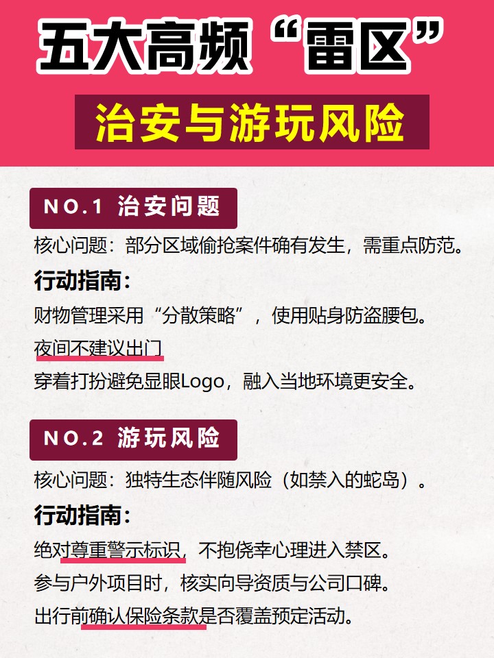 ▪️ 对策:一定遵守警示牌;选户外项目先查向导资质;买保险时确认项目覆盖