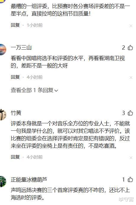 那英的点评依然如她长相打扮一样简单粗暴违和,装嫩时尚不合时宜,点评依然啰啰嗦嗦没有高度,完全是观众视角谈感受,然后说些不合时宜的话。华晨宇也是支支吾吾,老是那几句话,没有爆发力,和乐队融合不好,加强唱功,然后就说不好选要弃权。殷秀梅看着两人像小丑一样表现,也不整顿职场,也跟着和稀泥,让人对她的专业权威很失望。总之三个臭皮匠也没顶一个诸葛亮,把比赛搞得乌烟瘴气很掉价。与央视评委阵容的专业权威,完全无法相提并论。