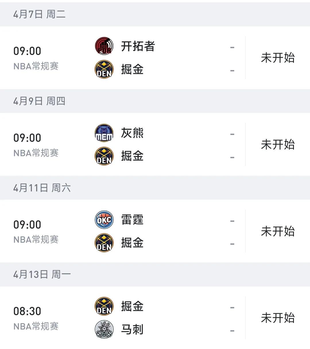 再来看掘金,拿下灰熊没问题,但是开拓者就不一定了,还有接下来就是打雷霆和马刺两场硬仗,但是打雷霆那场比赛,雷霆大概率是已经锁定了西部第一的位置,而雷霆又想在第二轮避开掘金的情况下,这场比赛雷霆极有可能会大面积轮休放水的。至于最后一场比赛,马刺,肯定还是想掘金回到西部第四的位置,应该会全力阻击!所以掘金最后大概率以2胜2负结尾!最终在52胜30负!